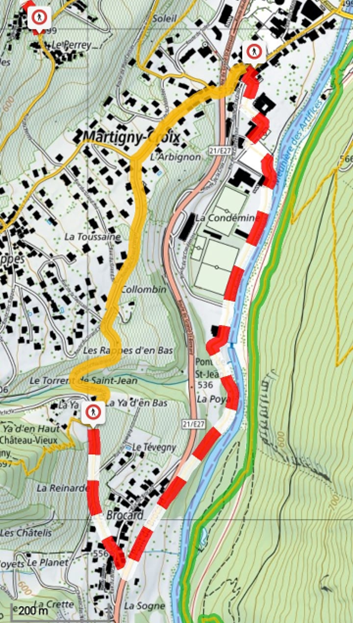 Suite aux travaux de protection et de renaturation de la Dranse (élargissement du cours d’eau), nous vous informons que le chemin pédestre allant de la déchetterie de Martigny-Croix au village du Brocard (le long de la Dranse) est fermé jusqu’au vendredi 20 mars 2026.