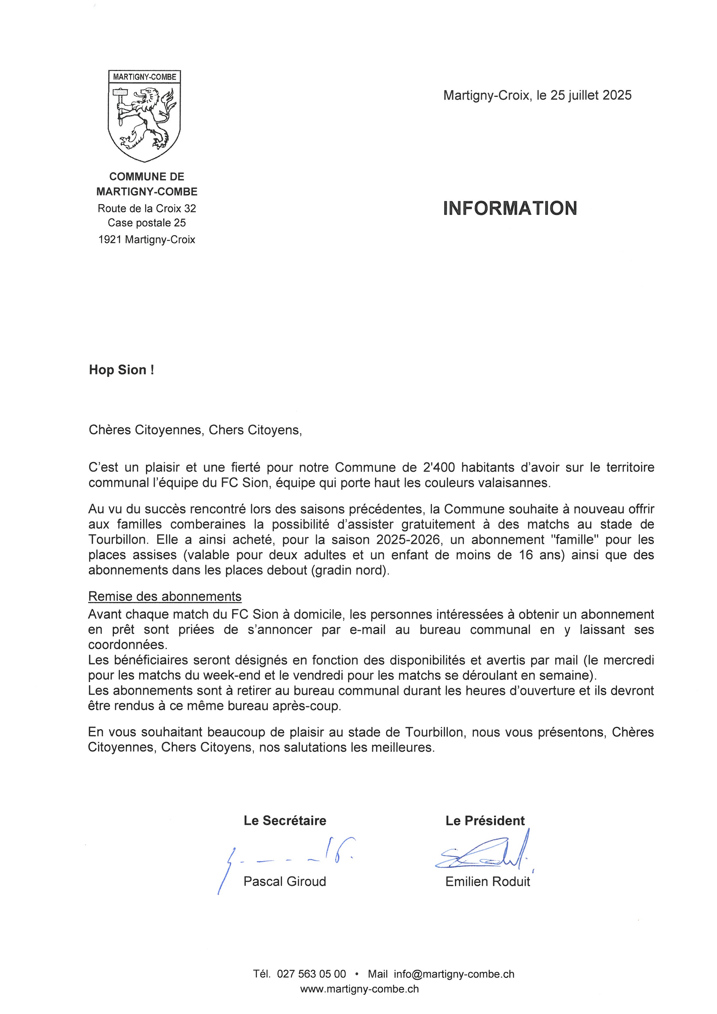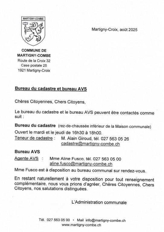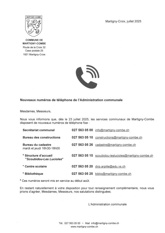 En restant naturellement à votre disposition pour tout renseignement complémentaire (bureau des constructions, tél. 027 723 29 00), nous vous prions d’agréer, Chères Citoyennes, Chers Citoyens, nos salutations distinguées.