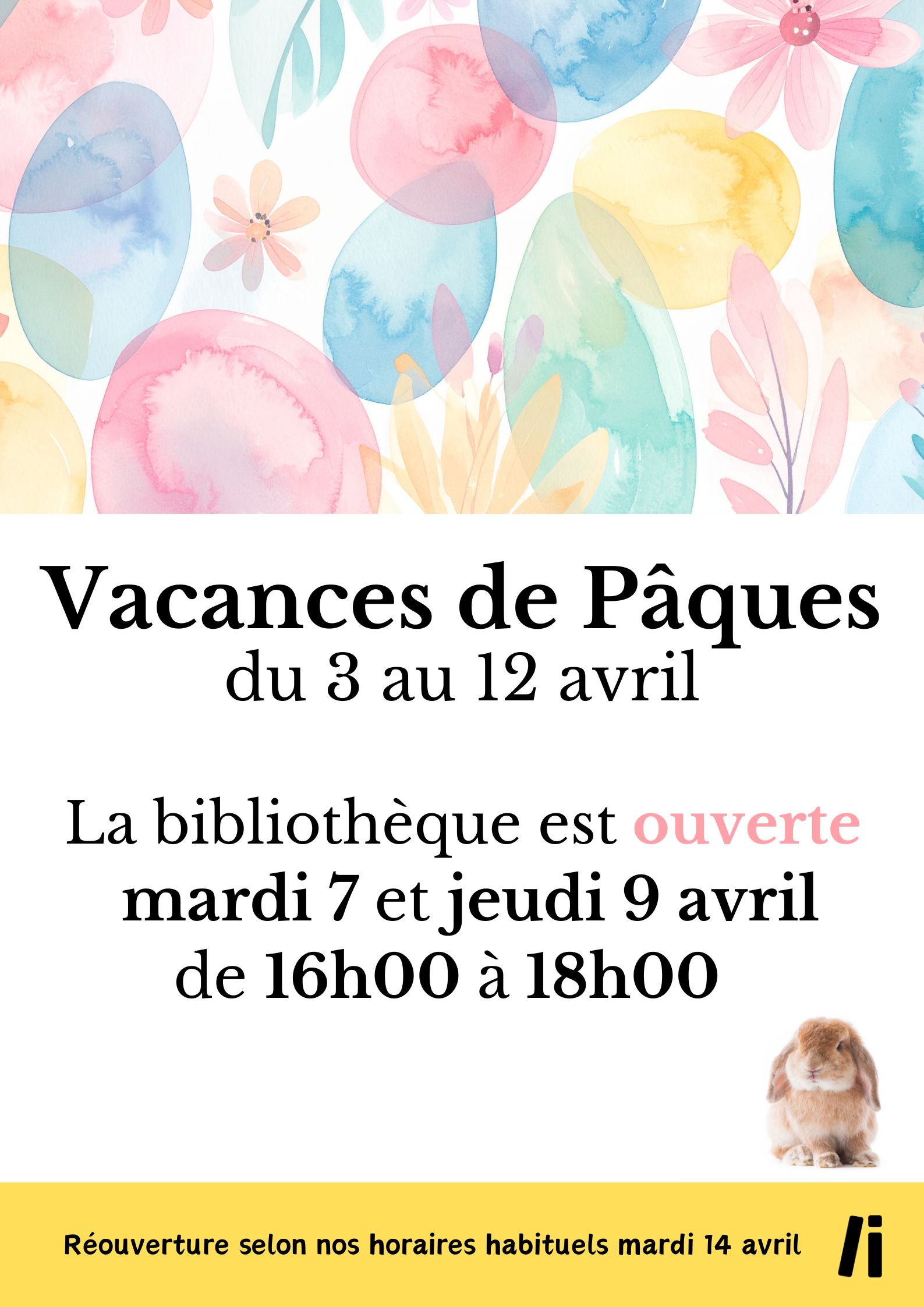 Du 3 au 12 avril, la bibliothèque est ouverte le mardi 7 et jeudi 9 avril de 16h à 18h